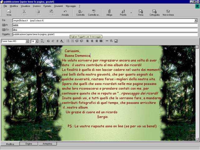 | L'e-mail che pubblico è quella di ringraziamento a chi ha voluto scrivermi per darmi le proprie impressioni sull'idea di pubblicare nel web delle foto della mia gioventù; nello stesso tempo è l'invito a chi legge, se si ritrova nelle foto di voler collaborare con me Invito i lettori a leggere l'e-mail e quindi, se vogliono, a visitare l'album. Scusate e grazie. |